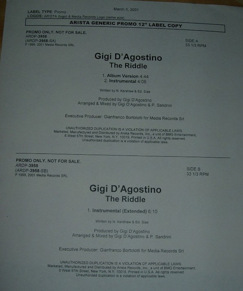 Released on some of the 1999/2000 "The Riddle" 12" record and CD singles.